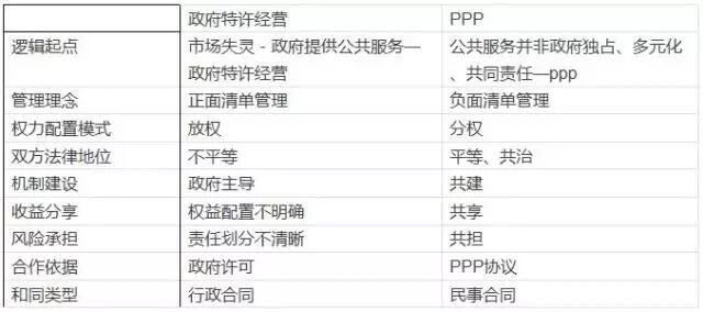 综上所述不难看出,政府特许经营与PPP是两种不同的治理模式和资源配置模式,政府也许经营主要侧重政府管理和配置资源,与政府指导公共服务、正面清单管理、行政授权的一脉相承;而PPP模式主要体现政府、市场、社会各方共治,与公共服务提供主体多元化、负面清单管理、国家治理现代等契合